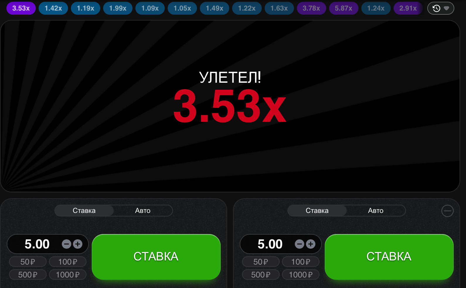Когда самолетик достигает значения х2, стопаем первую ставку, тем самым вы перекрываете вторую ставку и выходите в ноль в текущем раунде. Далее уже без риска дожидаетесь диапазона х5-12 и стопайте вторую ставку. Если посвятить этой тактике достаточно много времени и иметь хороший размер банка, то будете получаеть значительную прибыль.